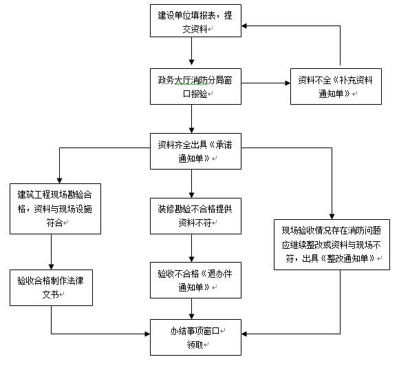 申报资料:1、建设工程消防验收申报表;2、工程竣工验收报告; 3、消防产品质量合格文件;4、消防设施、电气防火技术检测合格证明文件; 5、施工、工程监理、检测单位的合法身份证明和资质等级证明文件; 6、其他依法需要提供的材料。(包括:建筑工程消防设计审核意见书、竣工图纸缩印A3纸张、隐蔽工程监理记录资料等)。 承诺时限:1、一般工程在10个工作日; 2、国家、省级重点工程在20个工作日之内;3、需要专家论证的消防设计工程在30个工作日内。 收费标准:不收费