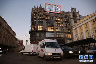 11月23日,在俄罗斯首都莫斯科,救护车停在中央百货商场附近。当日,莫斯科中央百货商场负一层发生火灾,据目前统计火灾没有造成人员伤亡。
