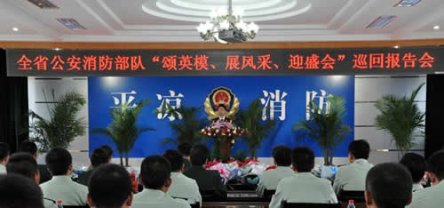金秋送爽,丹桂飘香,为隆重纪念胡锦涛总书记作出“三句话”总要求重要批示三周年,进一步激励部队士气,鼓舞官兵斗志,有效缓解官兵在工作、训练和执勤等方面的思想压力,以实际行动喜迎党的十八大胜利召开。9月4日下午,全省公安消防部队“颂英模、展风采、迎盛会”巡回报告首场宣讲在平凉隆重举行。总队政治部副主任刘双文带领报告团全体人员出席报告会,平凉支队在家党委成员、支队机关全体干部以及崆峒大中队全体官兵共70余人在支队六楼会议室济济一堂,共赏英模风采,聆听英模事迹。