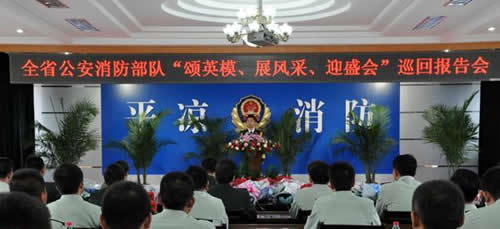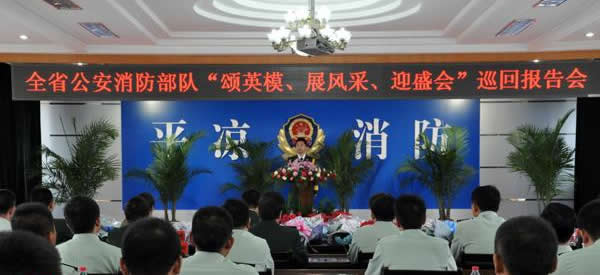 金秋送爽,丹桂飘香,为隆重纪念胡锦涛总书记作出“三句话”总要求重要批示三周年,进一步激励部队士气,鼓舞官兵斗志,有效缓解官兵在工作、训练和执勤等方面的思想压力,以实际行动喜迎党的十八大胜利召开。9月4日下午,全省公安消防部队“颂英模、展风采、迎盛会”巡回报告首场宣讲在平凉隆重举行。总队政治部副主任刘双文带领报告团全体人员出席报告会,平凉支队在家党委成员、支队机关全体干部以及崆峒大中队全体官兵共70余人在支队六楼会议室济济一堂,共赏英模风采,聆听英模事迹。